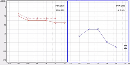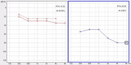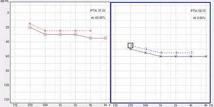 <span style="font-size:16px;"> 純音聽閾測試是聽力學所有測試項目中最基本的一項內容,包括氣導(AC)、骨導(BC)、最舒適閾(MCL)與不舒適閾(UCL)測試。測試結果能夠直接反映患者雙耳的聽力損失程度、性質與動態范圍,還能夠間接反映患者的患病位置、病因與助聽后效果。</span></p><p><span style="font-size:16px;"> 一般地,整個檢查控制在10分鐘左右,既能全面做完檢查,又不至患者疲憊而影響主觀反應。</span></p><p><span style="font-size:16px;"> 純音聽閾測試是最考驗聽力學工作者實際工作能力的一項基本內容:</span></p><p><span style="font-size:16px;"> 1、若患者曾長期暴露于噪聲中,且無其它致聾因素,很可能在3 kHz或6 kHz出現明顯的下降,聽力曲線呈現“V”字形,所以除了常規的倍頻程頻率外,還要加測這兩個頻率,否則就犧牲了多通道助聽器的意義;</span></p><p><span style="font-size:16px;"> 除了有過噪聲接觸史的患者需要加測半倍頻程外,涉及聲場助聽聽閾評估、賠償等情況都需要加測半倍頻程。</span></p><p><span style="font-size:16px;"> 耳鳴困擾的患者,注意避免與耳鳴聲類似的純音,若還用純音作為刺激聲,患者就會分辨不清,出現假陽性或假陰性。所以,測試者要換成囀音,既有別于耳鳴聲,又具有頻率特異性。</span></p><p><span style="font-size:16px;"> 2、不舒適閾反映患者對大聲的忍耐力,不舒適閾與氣導的差值能顯示患者的動態范圍,指導驗配師調節助聽器的最大輸出。</span></p><p><span style="font-size:16px;"> 不舒適閾測試頻率是否越多越好呢?非也。測得頻率過多,一會引起患者疲勞或不適,二是沒必要,大多數助聽器的最大輸出是一個整體,不能像調增益和壓縮那樣分通道,所以測多了并無好處,一般測0.5、1、2、4 kHz。</span></p><p><span style="font-size:16px;"> 3、如果兩側聽力有明顯差異,此時就要準備好掩蔽了,分為氣導掩蔽與骨導掩蔽。</span></p><p><span style="font-size:16px;"> (1)氣導掩蔽的判斷有兩個原則,只要符合其中一個原則,就需要重新測差耳氣導。具體做法是:</span></p><p><span style="font-size:16px;"> 測試完雙耳氣導,若發現某一頻率差耳氣導閾值比好耳氣導閾值多40 dB以上就要懷疑有可能是好耳偷聽的,需要給好耳氣導加掩蔽聲;</span></p><p><span style="font-size:16px;"> 測試完雙耳氣導與好耳骨導,若發現某一頻率差耳氣導閾值比好耳骨導閾值多40 dB以上就要懷疑有可能是好耳偷聽的,需要給好耳氣導加掩蔽聲。</span></p><p><span style="font-size:16px;"> 下面為未掩蔽的聽力圖:</span></p><center><span style="font-size:16px;"><img alt="" src="/upfiles/201810160133207570.png" width="440" height="220" /></span></center><p></p><p><span style="font-size:16px;"> 下圖為掩蔽后的左耳真實氣導值:</span></p><center><span style="font-size:16px;"><img alt="" src="/upfiles/201810160133289538.png" width="440" height="220" /></span></center><p></p><p><span style="font-size:16px;"> (2)骨導掩蔽的判斷原則:</span></p><p><span style="font-size:16px;"> 測試完雙耳氣導與好耳骨導,若發現某一頻率差耳氣導閾值比好耳骨導閾值大于等于15 dB就必須予以掩蔽,重測骨導。下圖為右耳氣導加掩蔽后左耳骨導的真實值:</span></p><center><span style="font-size:16px;"><img alt="" src="/upfiles/201810160133368026.png" width="440" height="220" /></span></center><p></p><p><span style="font-size:16px;"> 注意:</span></p><p><span style="font-size:16px;"> 1)掩蔽的規則要按順序適用;</span></p><p><span style="font-size:16px;"> 2)各頻率根據規則決定是否需要加掩蔽;</span></p><p><span style="font-size:16px;"> 3)很少需要掩蔽所有頻率,通常氣導掩蔽頻率不應超三個,骨導掩蔽頻率不應超兩個,否則受試者會疲憊不堪。</span></p><p><span style="font-size:16px;"> 醫院測聽的主要目的是診斷和鑒別聽力損失的性質和程度,驗配中心的主要目的是盡可能地幫助患者選擇并調試好助聽器。</span></p><p><span style="font-size:16px;"> 更多詳情請登錄www.china-wuhuan.com</span></p>" />