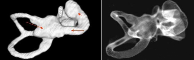 先天性內耳畸形的疾病種類繁多,診斷比較困難,隨著高分辨CT和磁共振(MRI)的應用,目前診斷率不斷提高。臨床常見的內耳畸形包括大前庭導水管綜合癥、先天性耳蝸畸形、米歇爾聽障及沙伊貝聽障。本篇將后三種畸形介紹如下:</p><p> 先天性耳蝸畸形(Congenital cochlear malformation)</p><p> 先天性耳蝸畸形又稱Mondini內耳發育不全,是最常見的一種內耳畸形。</p><p> 1、病因</p><p> 本病可為常染色體顯性或隱性遺傳病,也可為非遺傳性因素,如風疹病毒感染、過多的放射線暴露以及反應停類藥物等引起。</p><p> 2、臨床表現</p><p> 先天性耳蝸畸形包括耳蝸扁平、耳蝸發育不良,特別是第二圈和頂圈發育不良,兩者合并為一個腔;前庭擴大,巨大的前庭導水管以及半規管畸形、內耳道擴大等癥。在具體病例中不一定以上所有的畸形同時出現,可僅出現其中一種或幾種畸形。</p><p> 3、聽力學表現</p><p> 出生即無聽力,或1~2歲時才出現聽力減退,主要為感音神經性聽障,部分可為混合性聽障,有部分患者可長期保存殘余聽力。個別患者可有眩暈發作。</p><p> 4、診斷</p><p> 主要根據聽力學表現和影像學檢查。通過高分辨CT可看到耳蝸畸形。內耳MRI顯示膜迷路內水充盈,耳蝸扁平,耳蝸第二圈與頂圈間隔缺損,以及半規管、前庭的畸形。</p><p> </p><center><img alt="" src="/upfiles/201903250158493159.png" width="640" height="200" /></center><p></p><p> 先天性耳蝸畸形伴前庭和外半規管發育不良</p><p> 5、治療</p><p> 目前尚無有效的治療方法。如有殘余聽力,可佩帶助聽器后進行語言康復。無殘余聽力或極重度聽障患者可考慮人工耳蝸植入。</p><p> 米歇爾聽障(Michel’s deafness)</p><p> 屬常染色體顯性遺傳,是最嚴重的內耳畸形,內耳可完全未發育,可伴有其它器官的畸形和智力障礙。</p><p> 1、診斷</p><p> 主要依靠顳骨高分辨CT和內耳MRI。</p><p> </p><center><img alt="" src="/upfiles/201903250158577271.png" width="640" height="160" /></center><p></p><p> 雙側內耳畸形:左側無內耳迷路及內耳道機構,為米歇爾畸形;右側空耳蝸及前庭擴大,為先天性耳蝸畸形</p><p> 2、治療</p><p> 目前無特殊辦法,此類病例不適合行人工耳蝸植入術,但是聽覺腦干植入術的適應癥,其效果有待進一步證實。</p><p> 沙伊貝聽障(Scheibe dysplasia)</p><p> 為常染色體隱性遺傳,是最輕的內耳畸形,畸形僅限于蝸管和球囊,故又稱耳蝸球囊型畸形。</p><p> 1、診斷</p><p> 主要根據先天性聽損和MRI檢查</p><p> 2、治療</p><p> 此病可選擇性地行人工耳蝸植入術。</p><p> 更多詳情請登錄聽覺有道助聽器www.china-wuhuan.com</p>" />