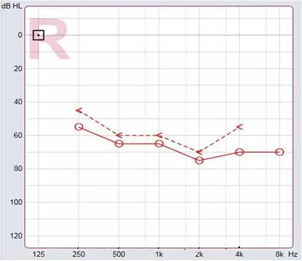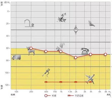 純音測試聽力圖的橫坐標為頻率,從左至右表示測試聲的頻率從低到高,即125Hz至8000Hz;縱坐標為強度,從上至下表示受試者能聽到的最小的聲音強度,以dBHL為單位。如下圖所示:</p><p> </p><center><img alt="" src="/upfiles/201903250213137760.png" width="440" height="400" /></center><p></p><p> 聽力圖的畫法自從1943年在C.C.Bunch的著作中出現后,至今沒有改變。通常右耳的測試結果用紅色表示,左耳用藍色。下圖是ASHA(1990)建議使用的各種標記符號,這些符號已在世界各地廣泛使用。</p><p> </p><center><img alt="" src="/upfiles/201903250213216822.png" width="440" height="250" /></center><p></p><p> 純音測試的測試項目有氣導、骨導、舒適閾與不舒適閾。那么這簡簡單單的聽力圖在驗配過程中有哪些重要作用呢?</p><p> 1、確定聽力損失程度</p><p> 按照世界衛生組織(WHO)1997年的標準,根據0.5kHz、1kHz、2kHz、和4kHz氣導平均聽閾值,將聽力損失分為輕度、中度、重度和極重度。</p><p> </p><center><img alt="" src="/upfiles/201903250213312187.png" width="440" height="180" /></center><p></p><p> 世界衛生組織(WHO-1997)的聽力障礙分級標準</p><p> 舉例</p><p> 下圖為某一聽力損失者所測得的聽力圖</p><p> </p><center><img alt="" src="/upfiles/201903250213367902.png" width="440" height="380" /></center><p></p><p> 0.5kHz的聽閾為65dBHL,1kHz的聽閾為65dBHL,2kHz的聽閾為75dBHL,4kHz的聽閾為70dBHL。則平均聽閾為(65+65+75+70)/4=68.75。將68.75dBHL代入以上分級表格,得到該聽力損失者的損失程度為重度。 聽力損失程度的確定有利于確定助聽器的功率。</p><p> 2、判斷聽力損失性質</p><p> 根據氣導、骨導的關系,可將聽力損失分為傳導性聽力損失、感音神經性聽力損失及混合性聽力損失。</p><p> 骨導與氣導之差大于10dB,且骨導在正常范圍內為傳導性聽力損失,表明聽力下降是由外耳、中耳病變引起。</p><p> 氣骨導一致(≤10dB)且都在正常范圍之外為感音神經性聽力損失。表明聽力下降是由耳蝸、聽神經損傷引起。</p><p> 骨導與氣導之差大于10dB,但骨導在正常范圍之外為混合性聽力損失,表明以上兩種聽力損失均有,由上述多種部位病變引起聽力下降。確定聽力損失性質還需結合臨床表現,也有助于助聽器佩戴效果的預測。</p><p> 3、解釋聽力損失者的日常生活困難</p><p> 聽力損失者在日常生活中經常遇到的問題有1)時而聽得到,時而聽不到;2)聽得到,聽不清;3)小聲聽不到,大聲受不了。</p><p> 時而聽得到時而聽不到</p><p> 以下圖平坦型聽力曲線為例,當周圍言語聲高于其聽閾,即處于曲線下方區域時,該聽力損失者能聽到;當周圍言語聲低于其聽閾,即處于曲線上方區域時,聽力損失者則聽不到對方的說話聲。此為“時而聽得到,時而聽不到”。</p><p> </p><center><img alt="" src="/upfiles/201903250213445950.png" width="440" height="340" /></center><p></p><p> 聽得到 聽不清</p><p> 中文漢語元音輔音的頻率及響度有其分布圖,如下圖所示。以陡降型聽力曲線為例,該聽力損失者聽不到大部分的輔音。聽得清不清楚,主要取決于高頻輔音聽得到聽不到。例如該聽力損失者“g”、“ch”聽不到,但“u”能聽到,因此,他會將“姑姑”、“出租”都聽成“uu”。聽不清楚時,再結合口型,前后句的冗余度猜測。猜對則談話繼續,猜錯則打岔。兒童聽力曲線若是如此,長期接收不正確的語音,會出現口齒不清。</p><p> </p><center><img alt="" src="/upfiles/201903250213526855.png" width="440" height="340" /></center><p></p><p> 小聲聽不到 大聲受不了</p><p> 小聲聽不到,大聲受不了是重振現象。以下圖聽力曲線為例,“飛機”處于不舒適閾附近,聽力損失者對“飛機”的聲音聽著受不了。另外,該聽力損失者聽不到“手表”等聲音。</p><p> </p><center><img alt="" src="/upfiles/201903250214013300.png" width="440" height="385" /></center><p></p><p> 為了更好地使聽力損失者家屬明白聽力損失者的困難,目前有較多的工具可以模擬聽力損失狀態下的溝通與交流。</p><p> </p><center><img alt="" src="/upfiles/201903250214075950.png" width="440" height="370" /></center><p></p><p> 比如,在聲音樣本中選擇“餐廳”,并選擇“正常”,可聽到正常聽力者在“餐廳”環境中聽到的聲音;若選擇“患者”,則可使聽力正常者聽到聽力損失者聽到的聲音,令聽力正常者親身體驗他們所處的“模糊世界”。</p><p> 在“典型聽力圖”中,有“輕度”、“中度”、“重度”、“極重度”、“陡降型聽力”等選項,若選擇“重度”,則可體驗重度聽力損失者所聽到的聲音。</p><p> 4、調試</p><p> 聽力圖在助聽器驗配調試過程中也起著非常重要的作用。</p><p> 首次驗配</p><p> 助聽器處方公式結合聽力圖計算出聽力損失者的目標增益,為驗配師的進一步調節奠定了基礎。聽力圖結果越準確,首次驗配的滿意度越高。</p><p> 調試</p><p> 在助聽器調試過程中,不能忽視聽力圖的作用。舉一實例:下圖為某助聽器佩戴者的聽力圖,經過多次降低高頻增益,仍反應聲音刺耳。通過對聽力圖的觀察,該佩戴者2kHz處的聽閾較高,且2kHz處的增益亦較多。將2kHz處的增益降低后,助聽器佩戴者的滿意度提高。</p><p> 讀懂聽力圖是驗配助聽器過程中非常重要的一環,只有讀懂聽力圖并解釋清楚聽力圖,對成功驗配助聽器可達到事半功倍的效果。在助聽器驗配調試環節,亦不能忽視聽力圖。聽力圖在整個助聽器驗配過程中起到不可替代的作用。</p><p> 更多詳情請登錄聽覺有道助聽器www.china-wuhuan.com</p>" /