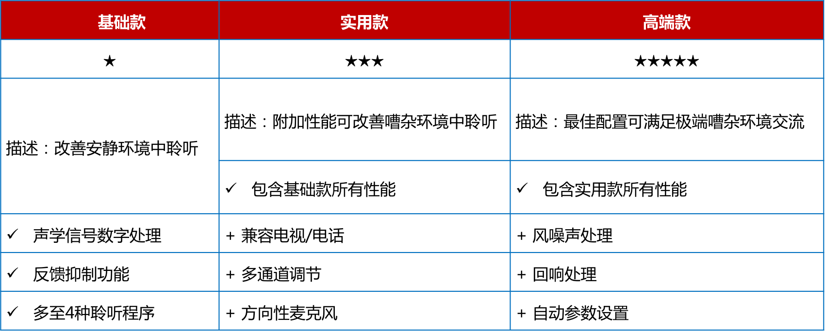 <span style="font-size:16px;"> 助聽器價格取決于機器的檔次,而檔次由內含的技術種類決定。助聽器檔次大致可分為基礎款、實用款、高端款。這三種檔次的區別請參見下表:</span></p><p style="text-align: center;"><span style="font-size:16px;"><img src="/upfiles/201808150226553383.png" width="640" alt="" /><br /></span></p><p><span style="font-size:16px;"> 那么,如何應該選擇哪種檔次的助聽器呢?</span></p><p><span style="font-size:16px;"> 選擇助聽器時主要需要考慮兩大因素。首先要考慮的就是弱聽人士的聽力損失程度,其次要考慮的就是弱聽人士的日常生活方式。比方說,某位弱聽人士是中度聽力損失,日常在家為主,那么實用款檔次助聽器通常可以滿足TA的需求。</span></p><p><span style="font-size:16px;"> 當然,這里只是為助聽器選配提供了大致方向,如何選配仍然需要具體情況具體分析,最好還是需要跟驗配師面對面溝通。</span></p><p><span style="font-size:16px;"> 1、高端款助聽器</span></p><p><span style="font-size:16px;"> 不同廠家的高端款助聽器均代表了各自的尖端技術,并致力于提供最佳的音質。</span></p><p><span style="font-size:16px;"> 這類助聽器高端之處在于自動適應各種聆聽環境,最優化佩戴者的聆聽清晰度和舒適度,讓佩戴者在極度嘈雜的環境中,如咖啡館,也能清晰地聽到同伴的言語聲。常見性能包括:</span></p><p><span style="font-size:16px;"> (1) 多種外觀、顏色可選;</span></p><p><span style="font-size:16px;"> (2) 環境自適應;</span></p><p><span style="font-size:16px;"> (3) 360°信號追蹤;</span></p><p><span style="font-size:16px;"> (4) 兼容各種藍牙設備。</span></p><p><span style="font-size:16px;"> 高端款助聽器為什么能夠自動適應各種聆聽環境呢?這是因為左右兩側的高端款助聽器能夠相互“通電報”,精準判斷所處的聆聽環境并自主學習,給出最佳的助聽設置。</span></p><p><span style="font-size:16px;"> 比如,您經常出入一家書店,每次您進入這家書店時總是習慣性地將音量調低2分貝;長此以往,當您再次進入該書店時,兩臺助聽器將會默契地降低2分貝。</span></p><p><span style="font-size:16px;"> 360°信號追蹤可以幫助佩戴者建立更佳的空間感知,對所處環境有充足的把控和預判,避免一些潛在的危險。而當助聽器連接至各種藍牙設備時,聆聽清晰度會更高,且不會打擾其他人。</span></p><p><span style="font-size:16px;"> 比如家人總是抱怨您把電視機聲音開得太大,拒絕跟您一起觀看電視時,您可以選配能夠兼容電視的助聽器,并進行獨立的音量調節,而家人只需設置為常規音量即可。高端款助聽器的價位一般在15000以上。</span></p><p style="text-align: center;"><span style="font-size:16px;"><img src="/upfiles/201808150228328500.jpg" alt="" /><br /></span></p><p><span style="font-size:16px;"> 2、實用款助聽器</span></p><p><span style="font-size:16px;"> 實用款助聽器的價格一般在8000~15000之間。實用款助聽器包含一定的降噪技術和言語提升功能,可以滿足大多數環境中的聆聽需求。部分廠家的實用款助聽器也可兼容各種藍牙設備。實用款助聽器的突出性能大致包括:</span></p><p><span style="font-size:16px;"> (1) 可連接外接音源;</span></p><p><span style="font-size:16px;"> (2) 言語清晰度提升;</span></p><p><span style="font-size:16px;"> (3) 方向性功能。</span></p><p><span style="font-size:16px;"> 3、基礎款助聽器</span></p><p><span style="font-size:16px;"> 基礎款助聽器的價位一般在8000以下。基礎款助聽器能夠滿足安靜環境中的交流需求,并具備反饋管理功能。反饋管理功能能夠有效提升佩戴舒適度,避免在日常佩戴過程中出現尖銳的干擾聲。</span></p><p><span style="font-size:16px;"> 基礎款助聽器適用于經常在家的弱聽人士,若是生活方式比較豐富多彩的弱聽人士建議選配其他檔次的助聽器。實用款助聽器的突出性能大致包括:</span></p><p><span style="font-size:16px;"> (1) 數字信號處理技術;</span></p><p><span style="font-size:16px;"> (2) 反饋管理功能;</span></p><p><span style="font-size:16px;"> (3) 多種聆聽程序可選。</span></p><p><span style="font-size:16px;"> 更多詳情請登錄www.china-wuhuan.com。</span></p>" />