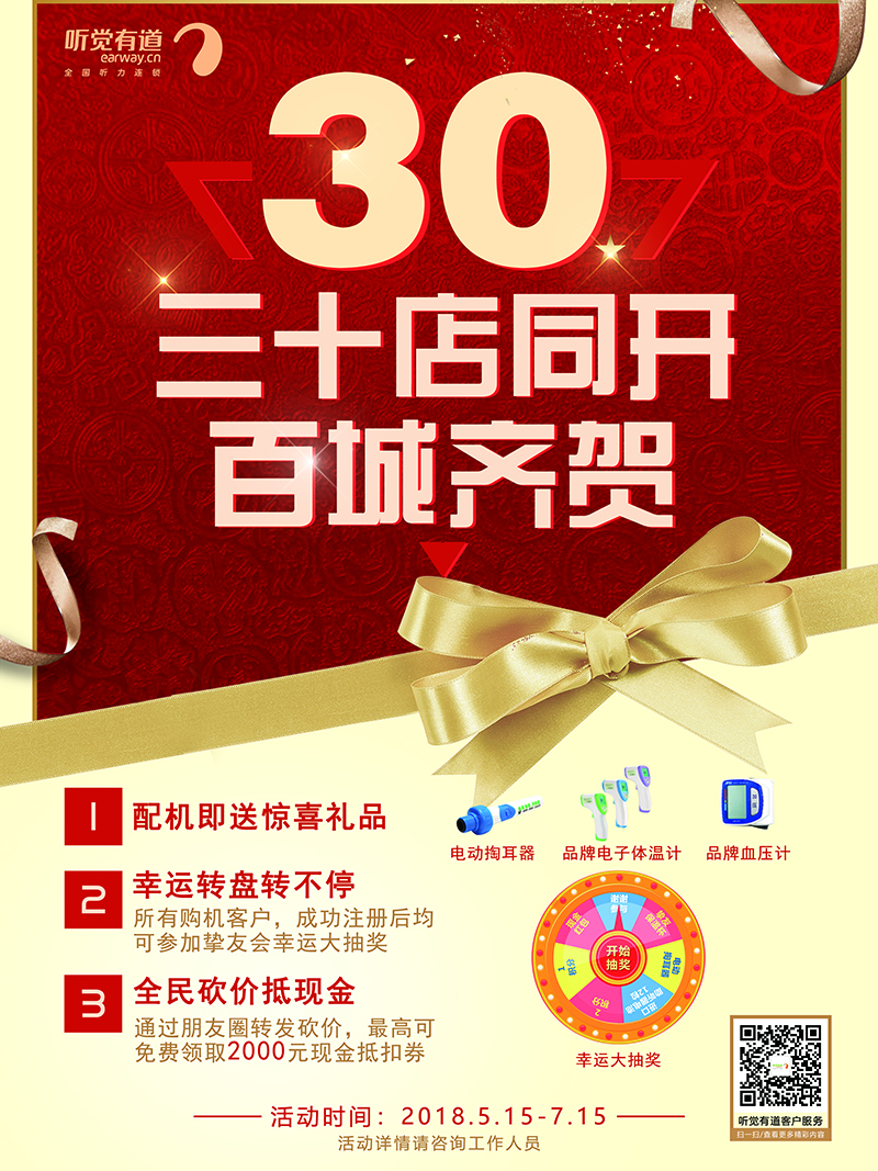 <span style="font-size:16px;"><img src="/upfiles/201805140533309372.jpg" alt="" /><br /></span></p><p style="text-align: center;"><span style="font-size:16px;"><br /></span></p><p><span style="font-size:16px;"> 聽覺有道助聽器驗配中心30家門店于5月15日正式開業,百城同慶!</span></p><p><span style="font-size:16px;"> 聽覺有道是一家高端、專業的全國聽力連鎖機構,有著近30年的助聽器驗配經驗,是廣東聽覺有道企業管理有限公司旗下品牌。</span></p><p><span style="font-size:16px;"> 公司現有專家級驗配師400多名,驗配服務中心遍布華西、華東、華南、華北主要省市,同時與GN集團進行戰略合作,代理美國貝爾通助聽器等助聽器品牌,擁有多條產品線:聽力篩查聽力篩查,聽力診斷,平衡診斷,助聽器驗配及專家級軟件(聽力診斷設備操作系統與患者信息服務管理系統),行業內領先的無線藍牙助聽器通訊技術,為聽障朋友提供一站式助聽器驗配解決方案!</span></p><p><span style="font-size:16px;"> 作為助聽器驗配行業的專業服務者,專業的驗配環境,專家級的驗配師,將時刻秉承專業全面的服務、豐富的驗配經驗及先進的驗配設備,同時為聽障朋友提供康復指導及助聽器售后服務,讓聽障朋友更好更放心地傾聽!</span></p><p style="text-align: center;"><span style="font-size:16px;"> <strong>我們的新門店地址(30家):</strong></span></p><p><span style="font-size:16px;"></span></p><p></p><p style="text-align: center;"><span style="font-size:16px;"> <strong>聽覺有道華南高端驗配中心</strong></span></p><p style="text-align: center;"><span style="font-size:16px;"><strong><img src="/upfiles/201805151039587785.png" alt="" /><br /></strong></span></p><p style="text-align: center;"><span style="font-size:16px;"> 電話:020-87066099</span></p><p style="text-align: center;"><span style="font-size:16px;"> 地址:廣州市天河區體育東路122號羊城國際商貿中心西塔1108(地鐵體育中心B出口前行100米,專家坐診,只接受預約)</span></p><p style="text-align: center;"><span style="font-size:16px;"><br /></span></p><p style="text-align: center;"><span style="font-size:16px;"> <strong>聽覺有道內蒙古呼市烏蘭察布服務中心</strong></span></p><p style="text-align: center;"><span style="font-size:16px;"><strong><img src="/upfiles/201805151040168591.png" alt="" /><br /></strong></span></p><p style="text-align: center;"><span style="font-size:16px;"> 電話:0471-3977839、13514714042</span></p><p style="text-align: center;"><span style="font-size:16px;"> 地址:內蒙古呼和浩特市賽罕區烏蘭察布東街路北(招商考試中心旁)</span></p><p style="text-align: center;"><span style="font-size:16px;"><br /></span></p><p style="text-align: center;"><span style="font-size:16px;"> <strong>聽覺有道成都金堂服務中心</strong></span></p><p style="text-align: center;"><span style="font-size:16px;"><strong><img src="/upfiles/201805151040458276.png" width="500" alt="" /><br /></strong></span></p><p style="text-align: center;"><span style="font-size:16px;"> 電話:17780478558</span></p><p style="text-align: center;"><span style="font-size:16px;"> 地址:成都市金堂縣趙鎮十里大道300號(一橫道路口)</span></p><p style="text-align: center;"><span style="font-size:16px;"><br /></span></p><p style="text-align: center;"><span style="font-size:16px;"> <strong>聽覺有道四川雅安服務中心</strong></span></p><p style="text-align: center;"><span style="font-size:16px;"><strong><img src="/upfiles/201805151041171639.png" alt="" /><br /></strong></span></p><p style="text-align: center;"><span style="font-size:16px;"> 電話:17738307596</span></p><p style="text-align: center;"><span style="font-size:16px;"> 地址:雅安市雨城區大南街22號(天主教堂對面)</span></p><p style="text-align: center;"><span style="font-size:16px;"><br /></span></p><p style="text-align: center;"><span style="font-size:16px;"></span></p><p style="text-align: center;"><span style="font-size: 16px;"> <strong>聽覺有道東營廣饒服務中心</strong></span></p><p style="text-align: center;"><span style="font-size: 16px;"><strong><img src="http://www.china-wuhuan.com/upfiles/20180515104347120.png" alt="" /><br /></strong></span></p><p style="text-align: center;"><span style="font-size: 16px;"> 電話:0546-6281512</span></p><p style="text-align: center;"><span style="font-size: 16px;"> 地址:東營市廣饒縣花苑路與兵圣路十字路口東行20米路北(醫藥公司對面)</span></p><p style="text-align: center;"><span style="font-size: 16px;"><br /></span></p><p style="text-align: center;"><span style="font-size: 16px;"> <strong>聽覺有道河南洛陽服務中心</strong></span></p><p style="text-align: center;"><span style="font-size: 16px;"><strong><img src="http://www.china-wuhuan.com/upfiles/201805151044003400.png" alt="" /><br /></strong></span></p><p style="text-align: center;"><span style="font-size: 16px;"> 電話:0379-64324338、16637990858</span></p><p style="text-align: center;"><span style="font-size: 16px;"> 地址:河南省洛陽市澗西區景華路8號(潤峰廣場正對面)</span></p><p style="text-align: center;"><span style="font-size: 16px;"><br /></span></p><p style="text-align: center;"><span style="font-size: 16px;"> <strong>聽覺有道山東聊城服務中心</strong></span></p><p style="text-align: center;"><span style="font-size: 16px;"><strong><img src="http://www.china-wuhuan.com/upfiles/201805151044136324.png" alt="" /><br /></strong></span></p><p style="text-align: center;"><span style="font-size: 16px;"> 電話:0635-8800602,15653110810</span></p><p style="text-align: center;"><span style="font-size: 16px;"> 地址:山東省聊城市東昌府區興華西路2號(五星百貨斜對面)</span></p><p style="text-align: center;"><span style="font-size: 16px;"><br /></span></p><p style="text-align: cent