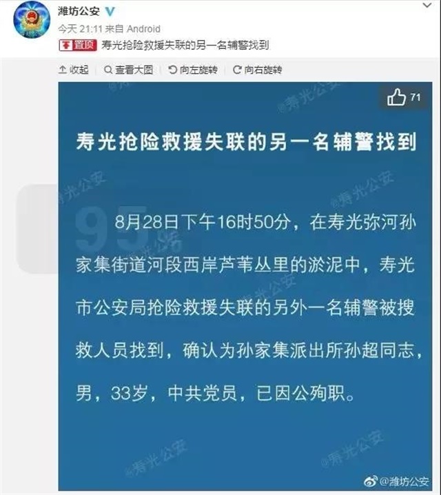 <span style="font-size: 16px;"> 2018年8月20日凌晨,壽光市兩名輔警在搶險救援時,被洪水沖走失聯。事發后,經過連續幾天的緊張搜救,他們以我們最不愿意看到的方式歸來了。</span></p><p><span style="font-size: 16px;"> 8月25日晚21時許,在彌河孫家集街道河段內發現一人,確認為孫家集派出所輔警魏澤坤同志(男,18周歲,因公殉職)。</span></p><p><span style="font-size: 16px;"> 8月28日下午16時,在彌河孫家集街道河段西岸發現另一名輔警,確認為孫家集派出所孫超同志(男,33歲,因公殉職)。</span></p><p><span style="font-size: 16px;"> 他是家里的頂梁柱啊</span></p><p><span style="font-size: 16px;"> 33歲的孫超是家里的頂梁柱,他的愛人郭立華是聽覺有道的店長。</span></p><p><span style="font-size: 16px;"> 孫超有一子一女,大女兒才滿10歲,父母年近60,身體都不是很好。還有一個85歲的老奶奶,身體也不好,孫超失蹤時,一家人一直都不敢告訴她消息。</span></p><p><span style="font-size: 16px;"> 18日早,因為下雨,孫超怕路不好走,還提前送郭店長到門店上班,然后才回派出所。</span></p><p><span style="font-size: 16px;"> 事發前2小時,他們夫妻互通了電話。孫超說,自己全身濕透了,水很大,11點之后,就沒有了音訊。</span></p><p><span style="font-size: 16px;"> 他們夫妻倆都是好員工,孫超還是共產黨員,他們沒有好好地拍過幾張全家福,甚至沒能抽空一家人好好玩一天。</span></p><p><span style="font-size: 16px;"> 孫超是個好老公,他一回家就看孩子,哄孩子睡覺,一有空就給老婆孩子洗衣服。為了省錢養家,他連幾十塊錢的鞋子都舍不得買,老婆給他買回來了,他還不舍得穿……</span></p><p><span style="font-size: 16px;"> 對于我們而言,郭店長和孫超都像家人一樣,我們多么期盼他是平平安安地回來。</span></p><p><span style="font-size: 16px;"> 化作春泥更護花</span></p><p><span style="font-size: 16px;"> 兩位輔警失蹤的幾天,我們看到了人們對英雄的珍惜。</span></p><p><span style="font-size: 16px;"> 濰坊市調集了1000多名警力、700多名沿河鎮街干部群眾、11支專業救援隊、18艘沖鋒舟、20架無人機、10頭搜救犬等,全線展開大范圍搜尋。</span></p><p><span style="font-size: 16px;"> 還有很多人民群眾,也自發參與了本次救援,總計6000多人,為了找到2個人,找了幾天幾夜,很多人都沒怎么好好睡覺。</span></p><p><span style="font-size: 16px;"> 他們最希望的,是把他們安全帶回來。反正無論如何,都要把他們找到。</span></p><p><center><img src="/upfiles/201808310437256664.jpg" alt="" /></center><center><br /></center><center> <img src="/upfiles/20180831043725120.jpg" alt="" /> </center><center><br /></center><center><img src="/upfiles/20180831043725884.jpg" alt="" /> </center><center><br /></center><center><img src="/upfiles/201808310437253890.jpg" alt="" /></center><center><br /></center><center> <img src="/upfiles/201808310437262486.jpg" alt="" /> </center><center><br /></center><center><img src="/upfiles/20180831043726269.jpg" alt="" /></center><center><br /></center><center> <img src="/upfiles/201808310437264172.jpg" alt="" /> </center><center><br /></center><center><img src="/upfiles/201808310437261506.jpg" alt="" /></center><center><br /></center><center> <img src="/upfiles/201808310437267495.jpg" alt="" /></center><center><br /></center><center> <img src="/upfiles/201808310437262138.jpg" alt="" /><span style="font-size: 16px;"> </span><span style="font-size: 16px;"> </span></center></p><p></p><p><span style="font-size: 16px;"> 而很多人,在各個地方關注著這一切。</span></p><p><span style="font-size: 16px;"> 他們可能身處中國的各個角落,平時有各自的愛好,從事著不同的職業,跟我們一樣,他們也都為兩位輔警擔憂過,祈禱過。</span></p><p><center><span style="font-size: 16px;"> <img src="/upfiles/201808310438352320.jpg" alt="" /> </span></center><center><span style="font-size: 16px;"><br /></span></center><center><span style="font-size: 16px;"><img src="/upfiles/201808310438359206.jpg" alt="" /></span></center><center><span style="font-size: 16px;"><br /></span></center><center><span style="font-size: 16px;"> <img src="/upfiles/201808310438359231.jpg" alt="" /></span></center></p><p></p><p><span style="font-size: 16px;"> 令人惋惜和哀痛的是,我們沒能等到想要的結局。但我們深知,兩位輔警并沒有徹底消失,在這片他們生活過的土地上,每一個角落都存在著他們的身影。</span></p><p><span style="font-size: 16px;"> 愿英雄安息</span></p><p><span style="font-size: 16px;"> 唯物者不信鬼神的存在,但兩位輔警的精神定與日月同輝;風雨飄搖盡顯英雄本色,被風雨洗禮的人們會記住孫超、魏澤坤這兩個名字,因為他們生命的最后一刻,始終代表著人民的名義。</span></p><p><span style="font-size: 16px;"> 兩位英雄,他們為了搶險救援,離開了人世。</span></p><p><span style="font-size: 16px;"> 他們把最美好的青春歲月獻給了警營,留給了老百姓,卻還沒來得及跟自己的家人說一聲再見,多么令人哀痛和讓人崇敬!</span></p><p style="text-align: center;"><span style="font-size: 16px;"><img src="/upfiles/201808310439091398.jpg" alt="" /></span></p><p style="text-align: center;"><span style="font-size: 16px;"><br /></span></p><p style="text-align: center;"><span style="font-size: 16px;"> <img src="/upfiles/201808310439095302.jpg" alt="" /></span></p><p style="text-align: center;"><span style="font-size: 16px;"><br /></span></p><p style="text-align: center;"><span style="font-size: 16px;"> <img src="/upfiles/201808310439092187.jpg" alt="" /> <br /></span></p><p></p><p><span style="font-size: 16px;"> 他們的親人會記住他們,國家會記住他們,我們會記住他